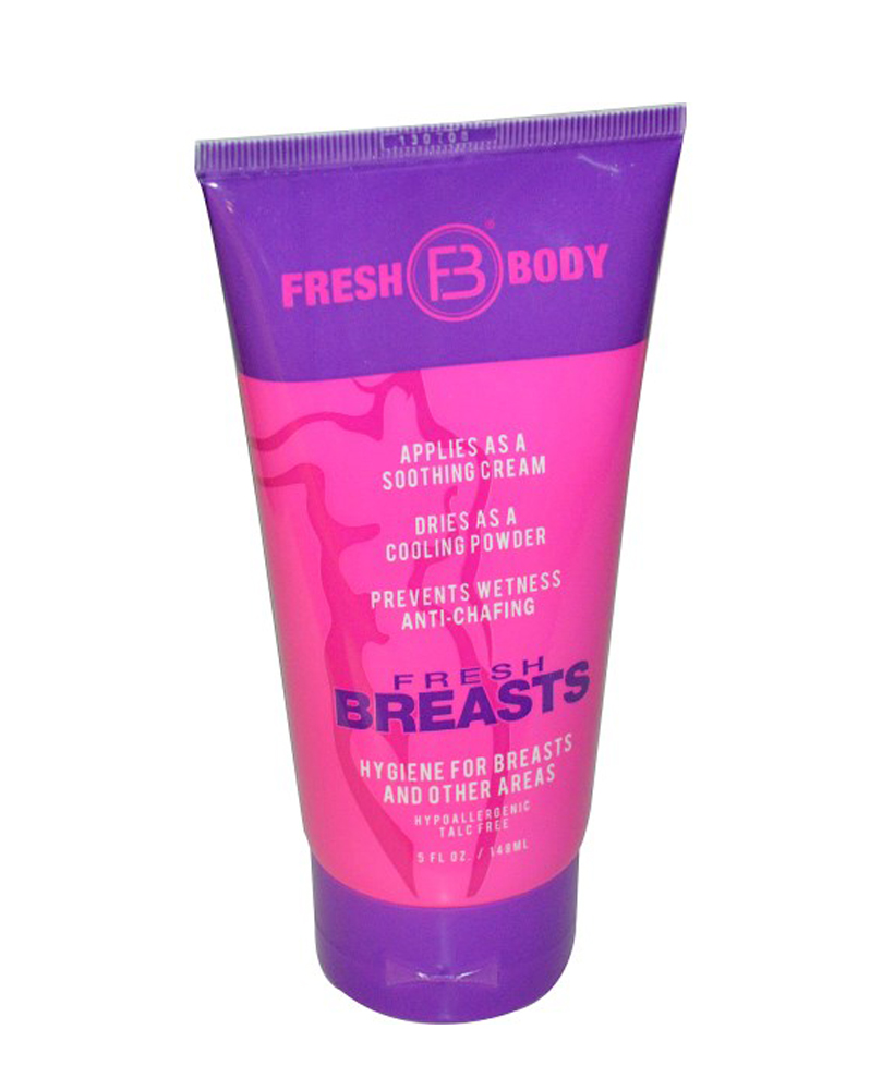Fresh Breasts® was scientifically created to keep you and your “girls” dry and unchafed so there’s no more of those uncomfortable and awkward arm-crossed encounters. Women can now rest easy; we’re replacing “swoobs” – dreaded boob sweat – with smiles! Applied as a lotion that quick-dries into a silky, clump-free powder, Fresh Breasts® can be applied as often as needed and is recommended as part of your daily routine. And, unlike most deodorants and powders, our natural scentless formula is free of all aluminum, parabens, and talc – just as nature intended. Welcome to The New Science of Dry. BENEFITS • Say goodbye to messy powders! • Applies as a soothing cream. • Dries as a cooling, silky non-talc powder. • Anti-chafing and prevents wetness. • Talc-free, paraben-free, aluminum-free. • Hypoallergenic and clinically tested. • Made in the USA. • Not tested on animals, just humans! THE REAL DEAL Let’s face it, how many more times can you walk into a room and let your boob sweat-soaked shirt make the first impression for you? Boob sweat, or “swoobs,” is a common, and uncomfortable, problem most women have to deal with daily – until now!